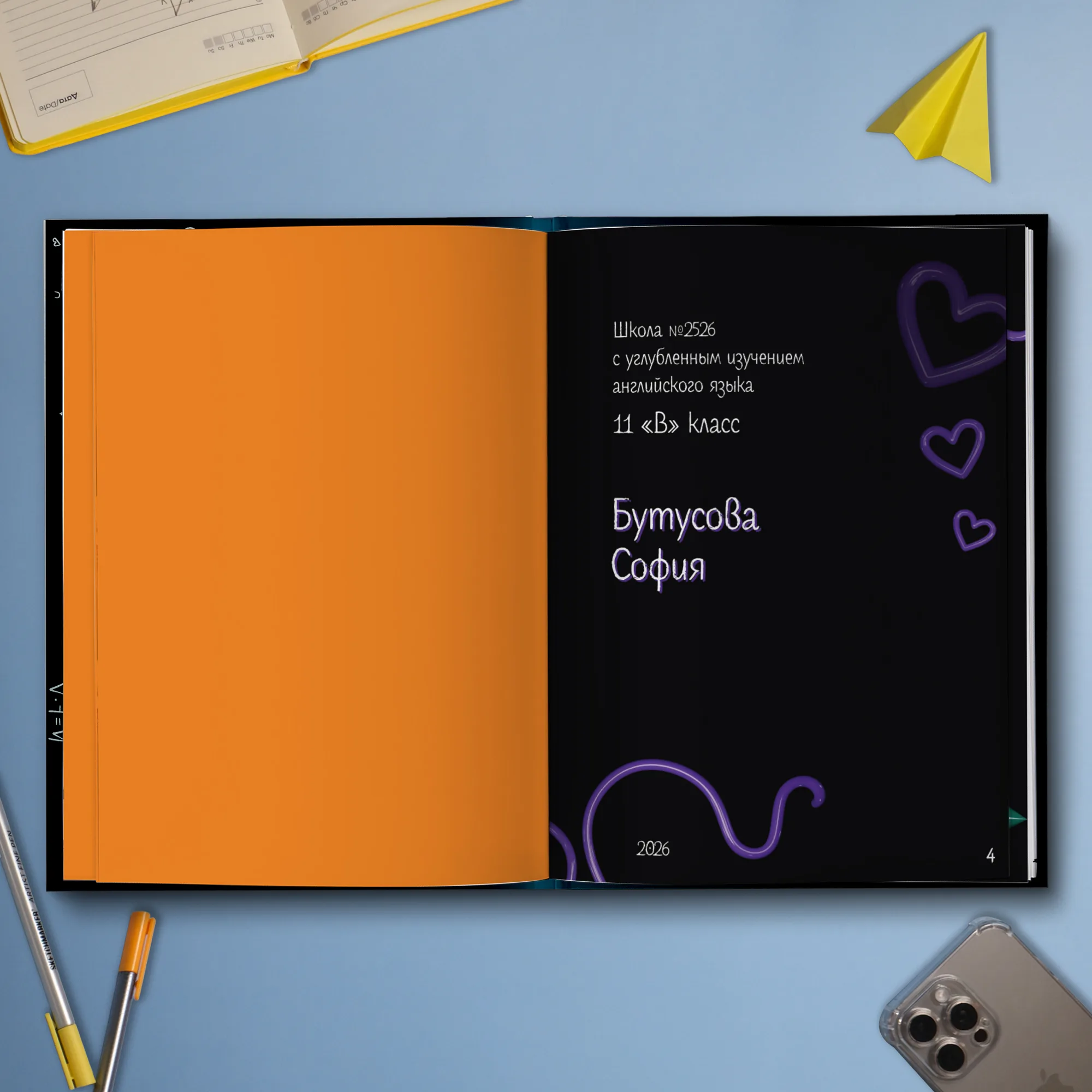 2ой разворот — разворот с ФИО и уч. заведением